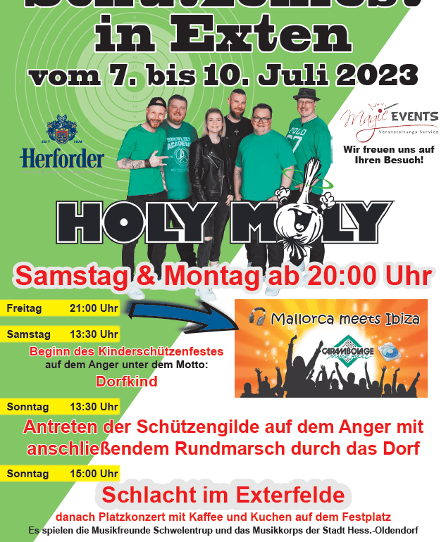 Auch wenn das Schützenfest am zweiten Juliwochenende zweifelsfrei den Höhepunkt des Schützenjahres in Exten bildet – gefeiert wird in der Schützengilde von Februar bis Oktober. Den Reigen eröffnen  traditionell die Eolendörper im Februar. Ab Mai treffen sich die Schütz:innen wieder regelmäßig zum Schießen im 1983 erbauten und in den Jahren 2021-2022 kernsanierten Schützenhaus auf dem […]